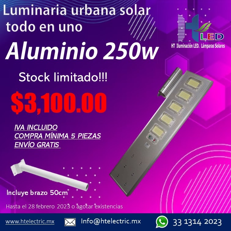 Más informaciónLámpara suburbana solar todo en uno 250w incluye brazo de 50cm fácil instalación, no requiere cableado.