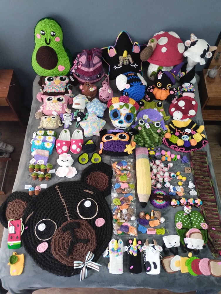Más informaciónLote de amigurumis que consta de: 1 - aguacate gigante 1 - tapete oso 1 - mochila gato rosa 1 - estrella unicornio 1 - hongo gigante con caracol 4 - búhos (diferente tamaño) 7 - gorritos 1 - portavasos huellitas de gato 1 - portavasos de aguacate 2 - portavasos de sandwich 2 - axolotes 2 - estrellas pequeñas 3 - carteras grandes 2 - carteras chicas 2 - pantuflas 1 - calavera grande 3 - bolsas pequeñas (oso, conejo y hongo) 1 - abeja azul 1 - gato halloween 1 - bufanda pegaso negro 1 - bufanda serpiente 5 - bolsitas celular 1 - lapiz 9 - mini ofrendas dÃa de muertos 5 - calaveritas 37 - llaveros 2 - ratones de los dientes 3 - moños 1 - pulpo miniatura Total de piezas: 102