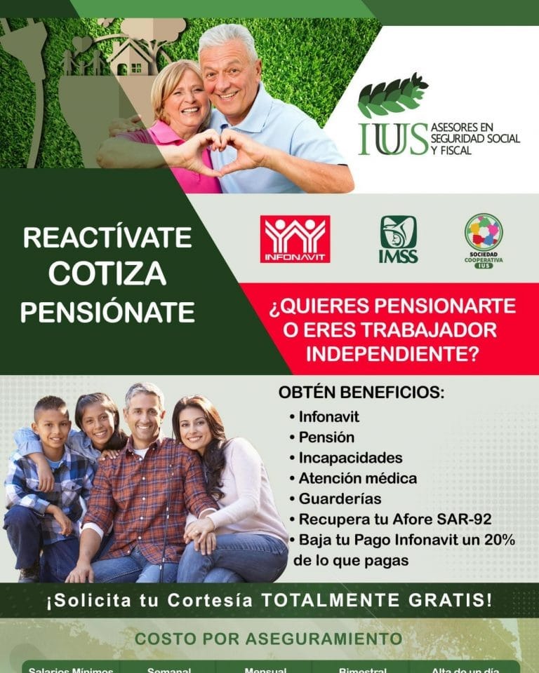 Más informaciónVUELVE A COTIZAR EN EL I M S S,. te volvemos a reactivar y vuelve a tener acceso a servicios médicos, a Infonavit, crédito Fonacot, guarderÃas, pensiones, etc. Solicitados tu cortesÃa de 7 dÃas. WhatsApp 5618482220
