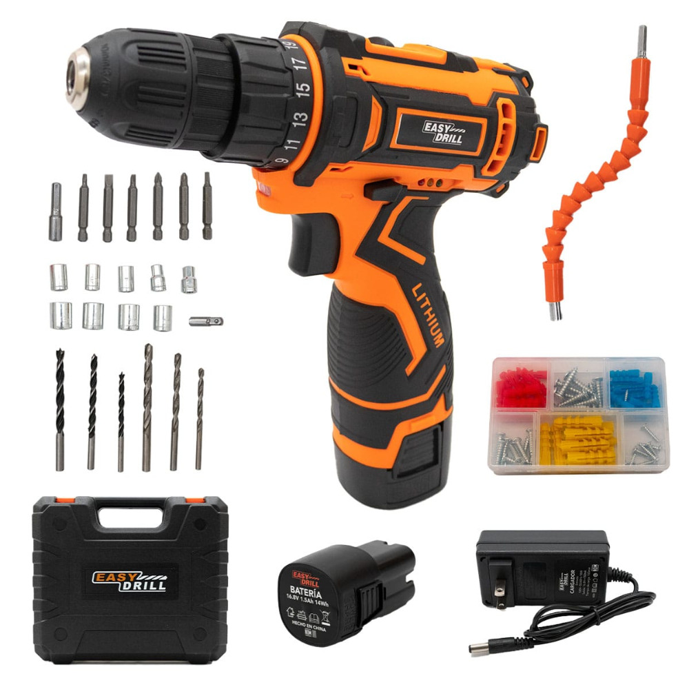 ¡Atornilla y Taladra! Trabaja con comodidad y de manera eficiente en tu hogar, taller u oficina con el Taladro inalámbrico . Puedes utilizarlo de manera inalámbrica, con mayor libertad de movimiento. Su mango ergonómico te ofrece una excelente sujeción cuando debas necesitar estabilidad. La batería recargable de Litio de 1300 mAh (incluye cargador) puede realizar una gran cantidad de ciclos de carga y descarga. Se tarda sólo 100 minutos en cargarse por completo, con un ciclo de vida de más de 250 veces, y la batería puede proporcionar hasta 35 Nm de Torque. El gatillo de velocidad variable le permite realizar un control de velocidad preciso con sus propios dedos. Además, el destornillador de impacto inalámbrico también tiene un botón de ajuste de 2 velocidades, 25 embragues de posición ajustable, 1 modo de perforación y un par máximo de 35 Nm, que puede satisfacer todas sus necesidades diarias. También es una buena herramienta para aficionados de la carpintería y artesanos. Todo el conjunto de herramientas está hecho de acero sintético, plástico reforzado y acero chapado y otros materiales con alta resistencia a la corrosión y durabilidad, con una larga vida útil. El taladro eléctrico recargable inalámbrico es más conveniente de usar sin estar restringido por el cable de carga. El producto se coloca en una caja especial moldeada por soplado, que es fácil de transportar y es un juego de herramientas esencial para el hogar y los viajes. Beneficios: Fácil de transportar y guardar. Atorinilla y taladra. Eléctrico.