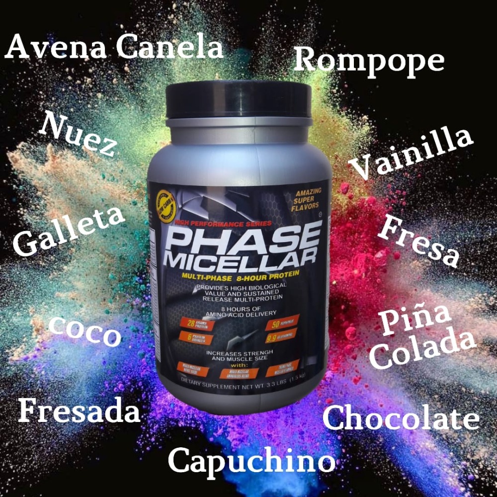 Phase Micellar es una proteina de lenta liberación que te proporciona energía, potencia y saciedad , la puedes tomar antes o después de tus rutinas, puede sustituir un alimento del día, gracias a la ingesta de 28 gramos por toma, ademas de sabores riquisimos que te enamorarán y te harán que phase micellar sea parte de tu alimentación diaria presentación de 1.5 kilogramos 55 tomas por envase