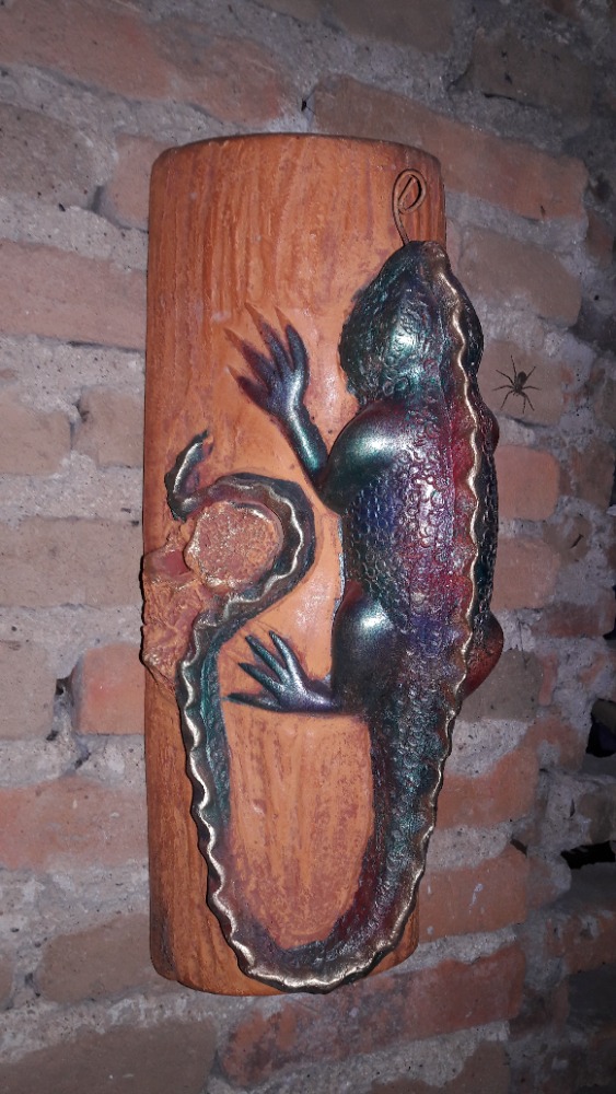 Jardinera Iguana en tronco producto hecho de barro y horneado a Alta temperatura