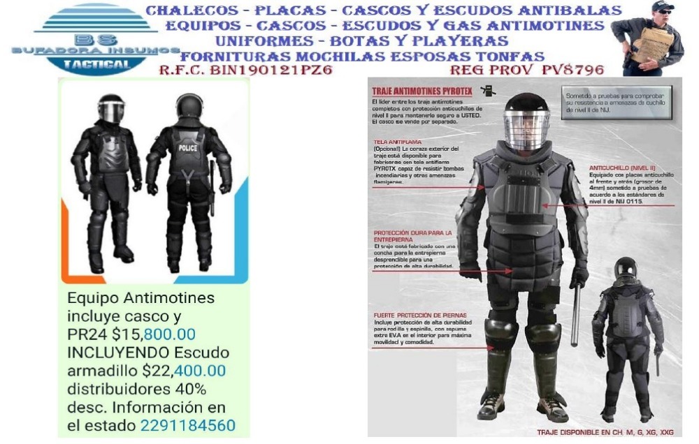 Más informaciónChalecos, Placas, Cascos, Escudos ANTIBALAS, Ropa de Vestir Antibalas para toda la Familia, Equipos y Productos Antimotines EN LA COMPRA DE MAS DE SEIS PIEZAS, PARES, JUEGOS, etc etc. SOLICITE su DESCUENTOS