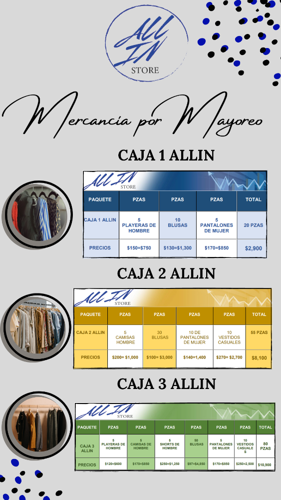 Más informaciónNosotros te ayudamos a emprender con las mejores marcas y los mejores precios , con ropa totalmente nueva en mayoreo y menudeo. Con maracas Zara , H&M ,Calvin Klein ,Forever 21 , Nike, adidas , etc CAJA 1 ALLIN - 20 PZAS = $2,900 CAJA 2 ALLIN- 55 PZAS = $8,100 CAJA 3 ALLIN-80 PZAS= $10,900