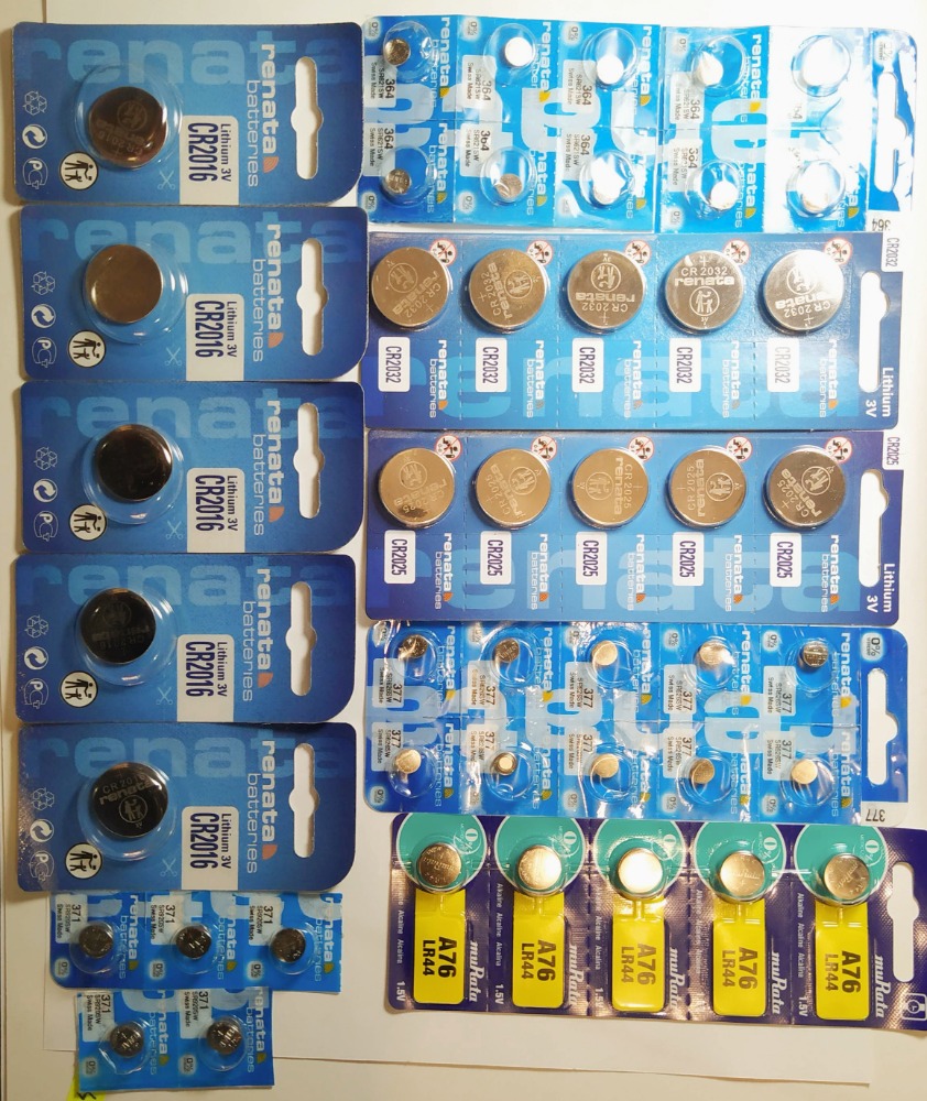 Más información45 pilas Renata Lithium y alcalina 5 pilas 2032 Lithium 3V 5 pilas 2025 Lithium 3V 5 pilas 2016 Lithium 3V 10 pilas 364 Swiss 1.55V 10 pilas 377 Swiss 1.55V 5 pilas 371 Swiss 1.55V 5 pilas LR44 Alcalina 1.5V