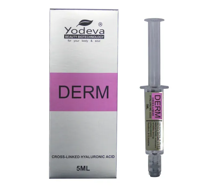 Más informaciónAcido Hialuronico Reticulado DERM ideal para: Arrugas moderadas, como comisuras glabelares y orales, lineas de sonrisa. El acido Hialuronico YODEVA esta formulado bajo los mas altos estándares de calidad, para ofrecerte el mejor producto al mejor precio. contenido: 1 jeringa con 5ml de acido hialuronico reticulado Derm. 1 adaptador esteril para rellenar jeringas. (es decir de la jeringa de 5 ml podrás rellenar otras jeringas haciendo con esto varias dosis según lo requieras). 2 agujas esteriles medida 25g