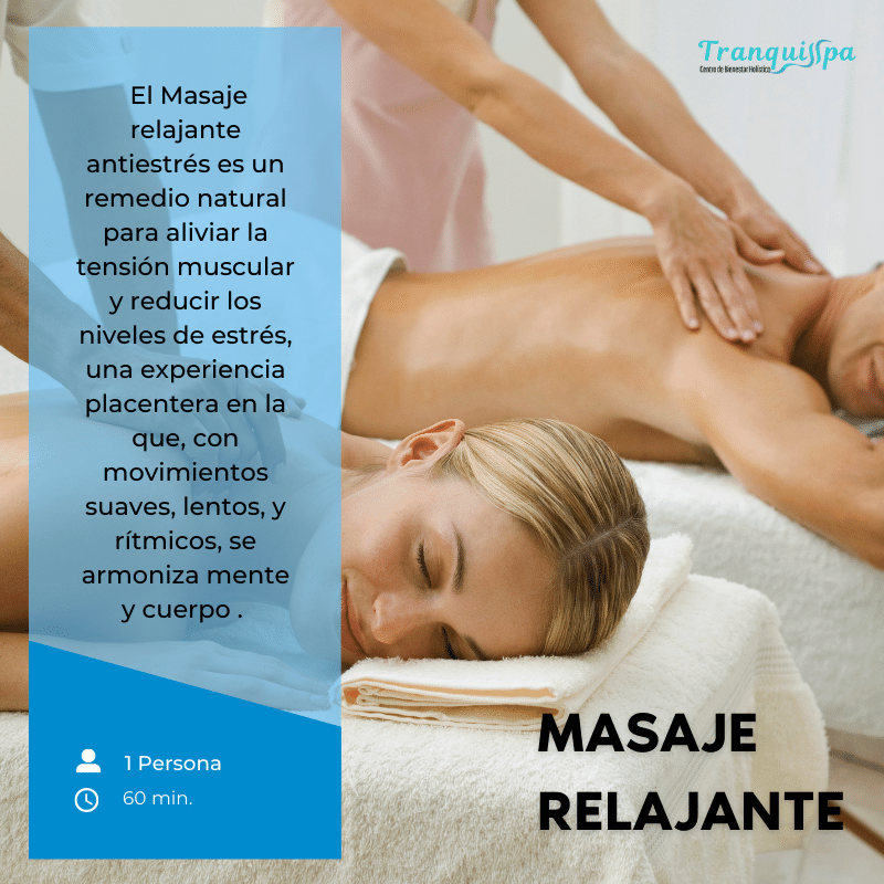 Más informaciónMasaje suave, lento, cadencioso, de maniobras poco profundas sutilmente se propicia un estado de relajación y bienestar para aliviar la tensión muscular, se combina con musicoterapia y aromaterapia. El ritmo lento largo o corto pero constante aumenta la producción de endorfinas (hormonas de la felicidad) Ayudando a restaurar la armonía interna y restablecer la energía del cuerpo