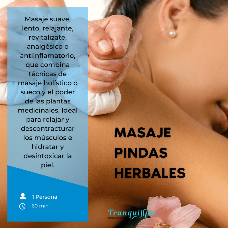 Más informaciónEste masaje es una experiencia sensorial que combina la aromaterapia, el masaje suave y lento y las pindas (bolsitas personalizadas hechas de telas naturales, que contienen en su interior el poder de hierbas, flores, plantas medicinales aromáticas, semillas y especias mezcladas con aceites esenciales). Las Pindas herbales se calientan al vapor para activar y liberar los aromas y propiedades naturales de los ingredientes de su interior y así obtener sus beneficios. Se desechan al finalizar el tratamiento.