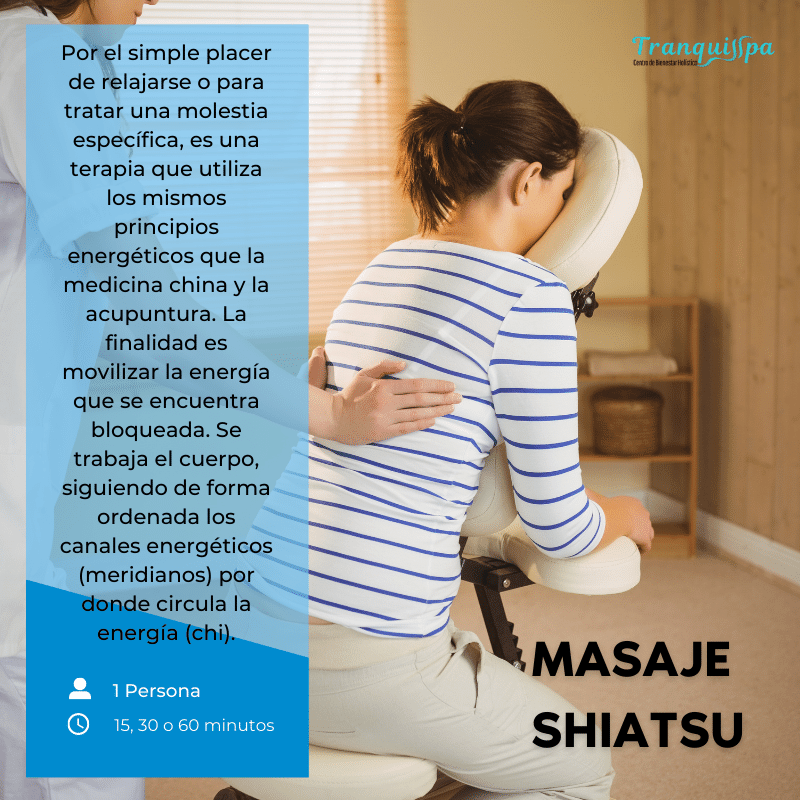 Más informaciónEs una terapia tradicional japonesa que tuvo su inicio en China, no es dolorosa ni invasiva se basa en los mismos principios energéticos que la medicina china y la acupuntura, con acupresiones en los puntos y canales energéticos en diferentes partes del cuerpo se logra liberar la energía estancada propiciando un bienestar general restableciendo la armonía y energía para un estado de equilibrio total.